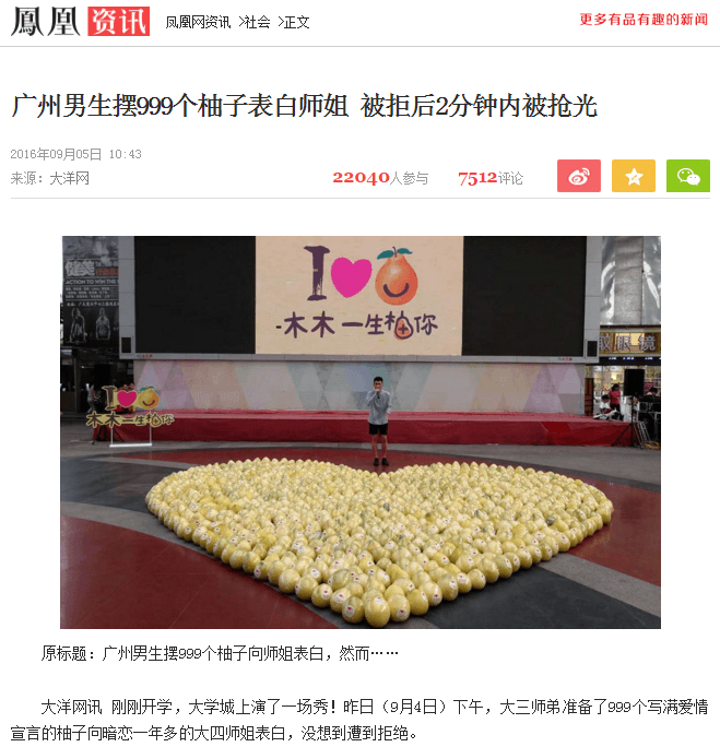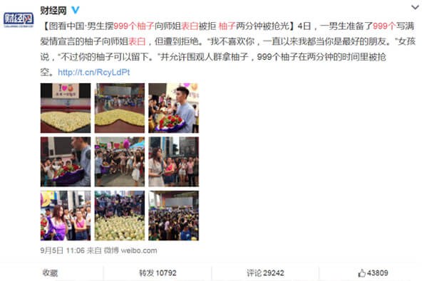 铭弘网络联合微博、微信,四大视频门户、新闻媒体通过柚子哥表白事件进行话题炒作宣传,曝光量达到千万级别,覆盖人群宣传达到一亿,柚子哥成为炙手可热的新生代网红,你想不想让柚子哥帮你品牌做宣传,想不想让你的品牌一炮而红?马上联系铭弘网络工作人员,定制属于你的网红营销方案,让你的销售一炮而红